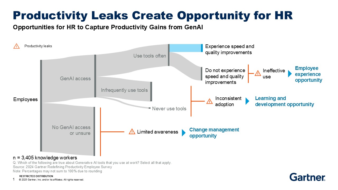 “HR owns change management, they own learning and development and they own the employee experience. These are the things that are actually preventing employees from delivering the productivity gains that AI promises.” (See graph below).